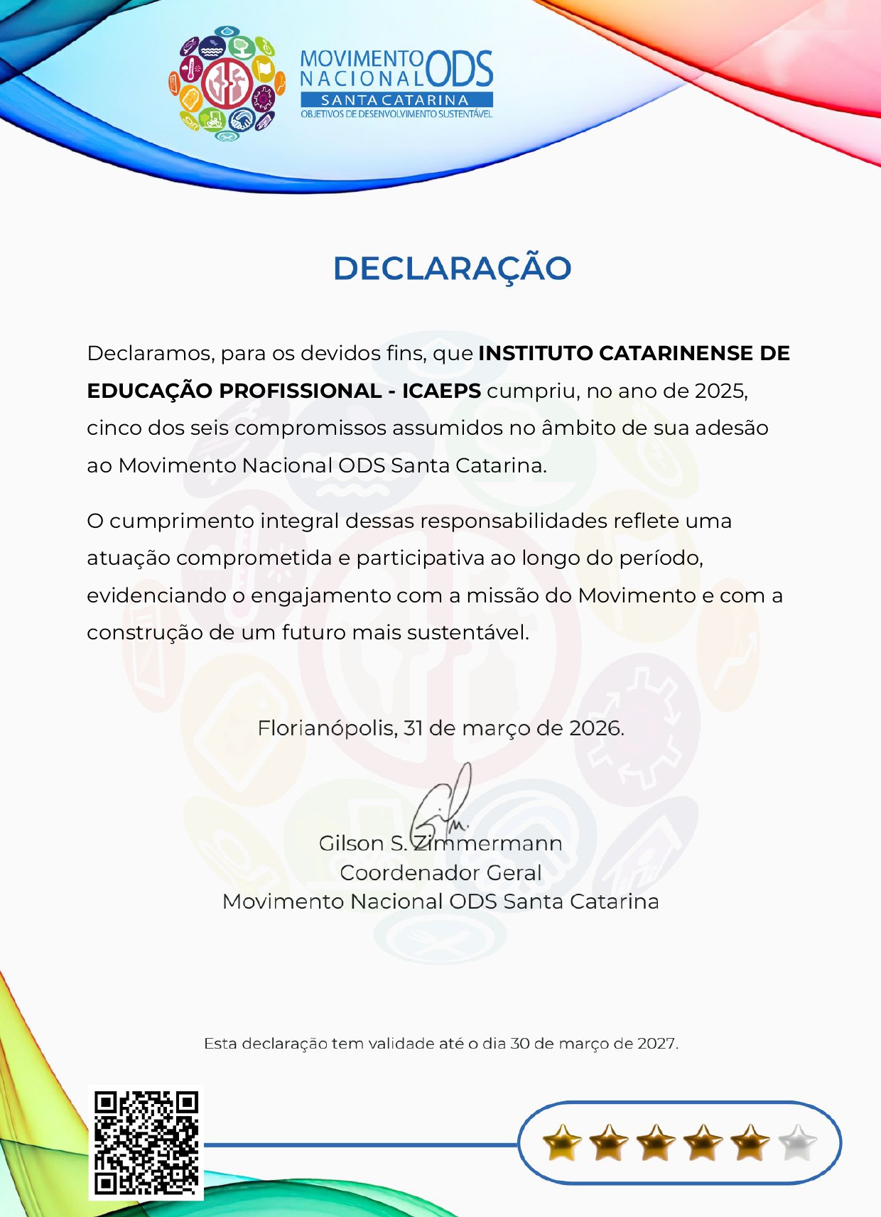 O ICAEPS foi reconhecido com o Selo Signatário 2026 do Movimento ODS-SC. A certificação, acompanhada de um certificado oficial, destaca o cumprimento dos compromissos assumidos pelo Instituto como integrante do Movimento Nacional ODS Santa Catarina ao longo de 2025.